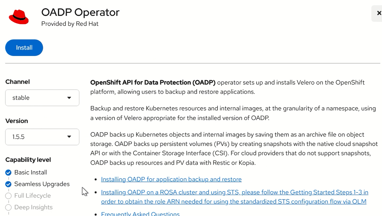 OpenShift API for Data Protection (OADP) product safeguards customer applications on OpenShift Container Platform. It offers comprehensive disaster recovery protection, covering OpenShift Container Platform applications, application-related cluster resources, persistent volumes, and internal images. OADP is also capable of backing up both containerized applications and virtual machines (VMs).