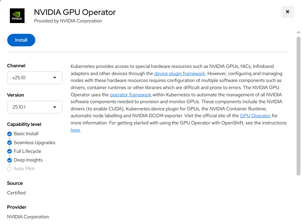- In the OpenShift Container Platform web console, from the side menu, select Ecosystem -> Installed Operators, and click NVIDIA GPU Operator.
