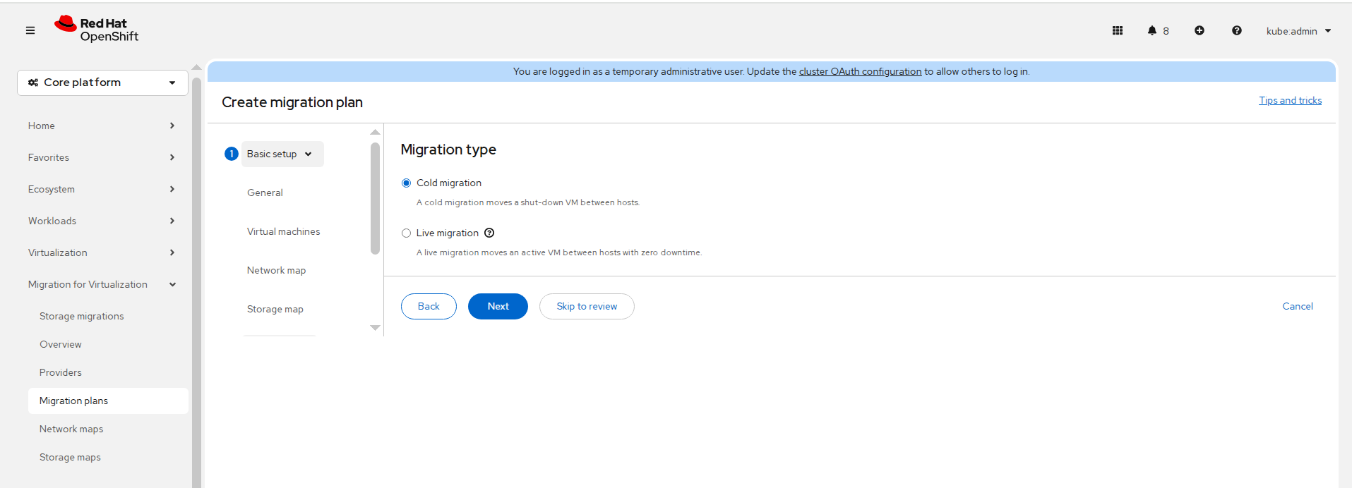 This step is required only for live migration. The transfer network cannot be configured from the web console during plan creation. Skip this step for cold or warm migration.