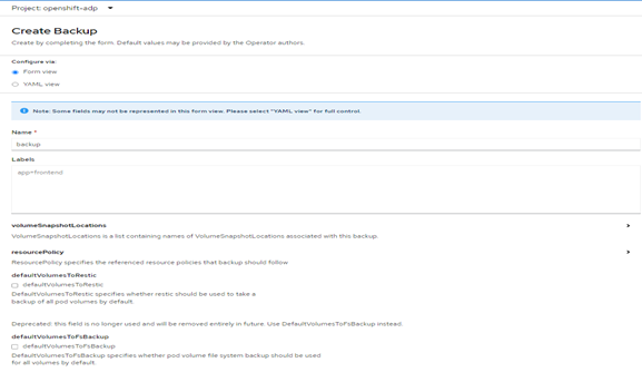 • Goto Installed Operators -> OADP Operator -> backup -> create backup