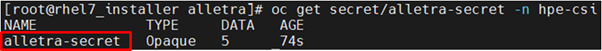 - The following output displays the status of the alletra-secret with the "hpe-csi" namespace.