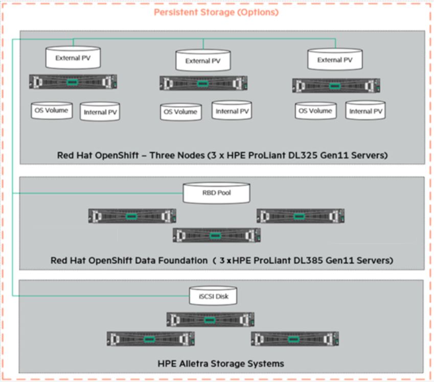 The OpenShift Container Platform 4.21 cluster comprises the master and worker nodes (physical and virtual) with CoreOS deployed as the operating system. The iSCSI interface configured on the host nodes establishes the connection with the HPE Alletra array to the cluster. Upon successful deployment of HPE CSI Driver, the CSI controller, CSI Driver, and 3PAR CSP and Nimble CSP gets deployed which communicates with the HPE Alletra array via REST APIs. The associated features on Storage Class such as CSI Provisioner, CSI Attacher, and others are configured on the Storage Class.