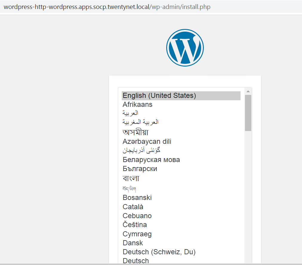 > oc get pods,pvc,route -n wordpressNAME READY STATUS RESTARTS AGE pod/wordpress-6f69797b8f-hqpss 1/1 Running 0 5m52s pod/wordpress-mysql-8f4b599b5-cd2s2 1/1 Running 0 5m52sNAME STATUS VOLUME CAPACITY ACCESS MODES STORAGECLASS AGE persistentvolumeclaim/mysql-pv-claim Bound pvc-ccf2a578-9ba3-4577-8115-7c80ac200a9c 5Gi RWO ocs-storagecluster-ceph-rbd 5m50s persistentvolumeclaim/wp-pv-claim Bound pvc-3acec0a0-943d-4138-bda9-5b57f8c35c5d 5Gi RWO ocs-storagecluster-ceph-rbd 5m50sNAME HOST/PORT PATH SERVICES PORT TERMINATION WILDCARD route.route.openshift.io/wordpress-http wordpress-http-wordpress.apps.socp.twentynet.local wordpress-http 80-tcp NoneAccess the route url in browser to access the WordPress application as shown below.