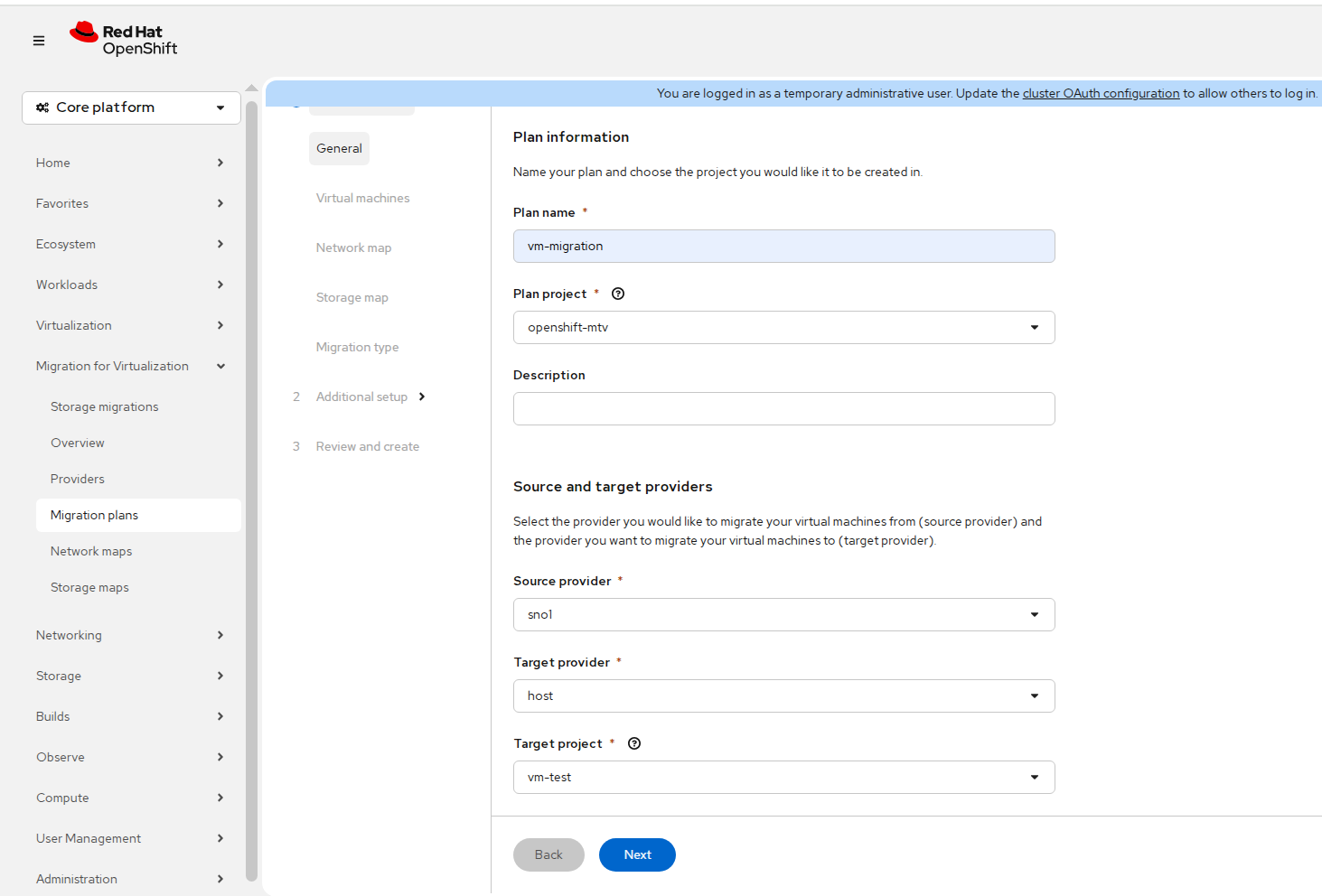 This step is required only for live migration. The transfer network cannot be configured from the web console during plan creation. Skip this step for cold or warm migration.
